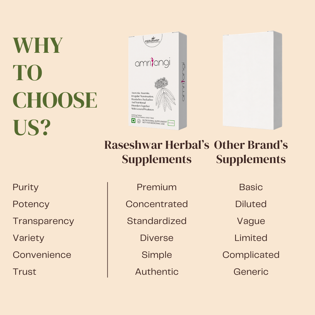 Raseshwar Herbal Amritangi is a powerful Ayurvedic formulation crafted especially for women experiencing anorexia, anaemia, irregular menstruation, headaches, backaches, nutritional deficiencies, and general weakness. This 1000 mg herbal blend contains 20 potent herbs traditionally used to support blood health, hormonal balance, strength, and overall female wellness. Each tablet delivers a unique synergy of botanicals designed to revitalise women’s health naturally and safely.