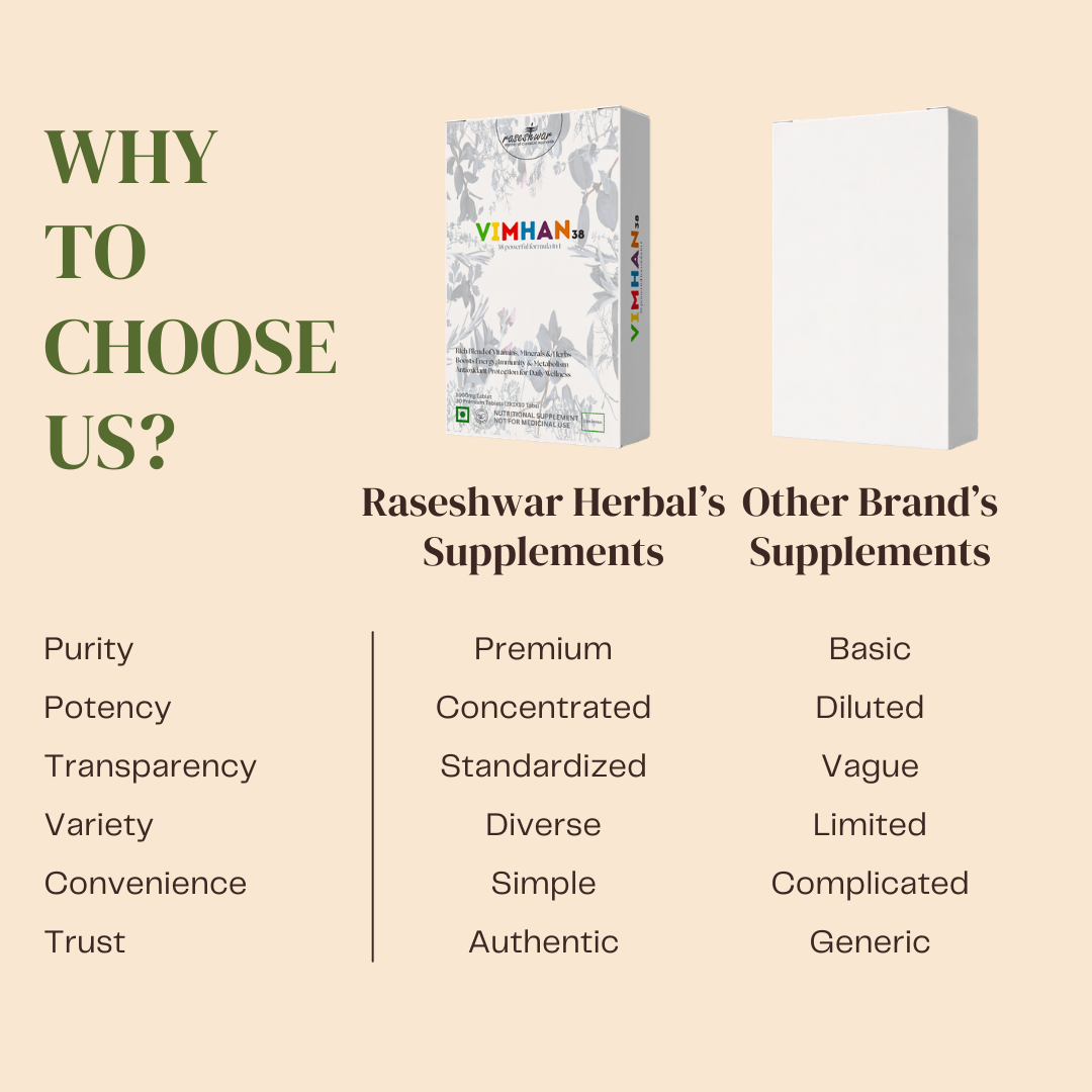 Raseshwar Herbal provides a special line of herbal products that are entirely natural and free from any dangerous synthetic ingredients. With a commitment to classical Ayurvedic principles and purity, each product is developed to deliver dependable, safe, and effective wellness support. VIMHAN-38 reflects the brand’s dedication to quality, authenticity, and truly natural supplementation.